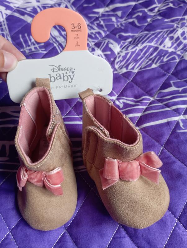 Размер 3-6 месяцев, на бирке написано ЕUR 17 мягких, высоких,збоковых на липучке. Фирма Disney baby.