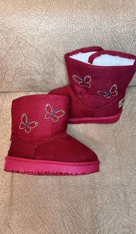 Угги малинового цвета зимние для девочек Новые. Принт с бабочками из бисера. На липучке, по этому легко можно обуть. Очень удобные, тёплые. Размер 25 (15см стелька)