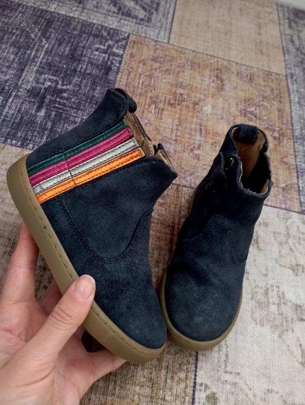 Шкіряні блискучі замшеві черевички в дуже гарному стані, слідів носки майже немає.Нові коштують від 1500тис