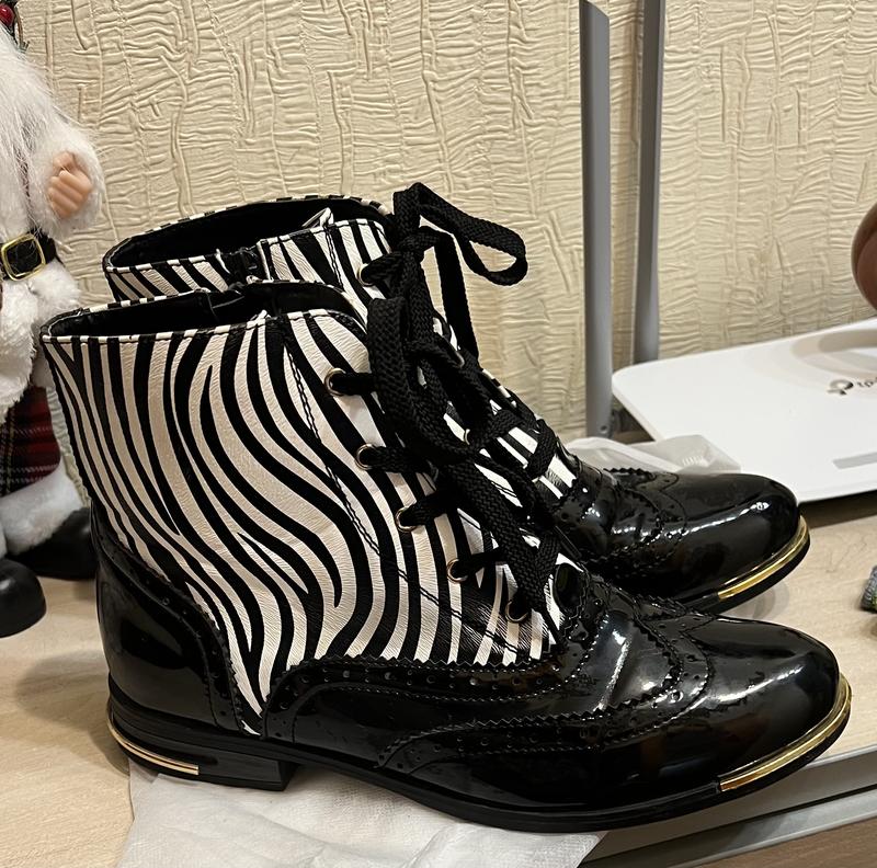 Черевики з зебровим принтом дуже стильні лакові стан ідеальний розмір 40 але йде на 39 повномірний реальному покупцеві буде скидка