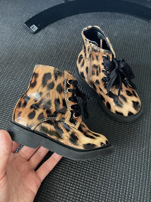 Милые леопардовые деми ботиночки сапожки на молнии и шнуровке для маленькой модницы Лакированный верх, не скользящая качественная подошва Размер 22 Стелька около 13,5-14 см Состояние отличное, но нужно заменить шнуровку (осыпается бархатное покрытие)