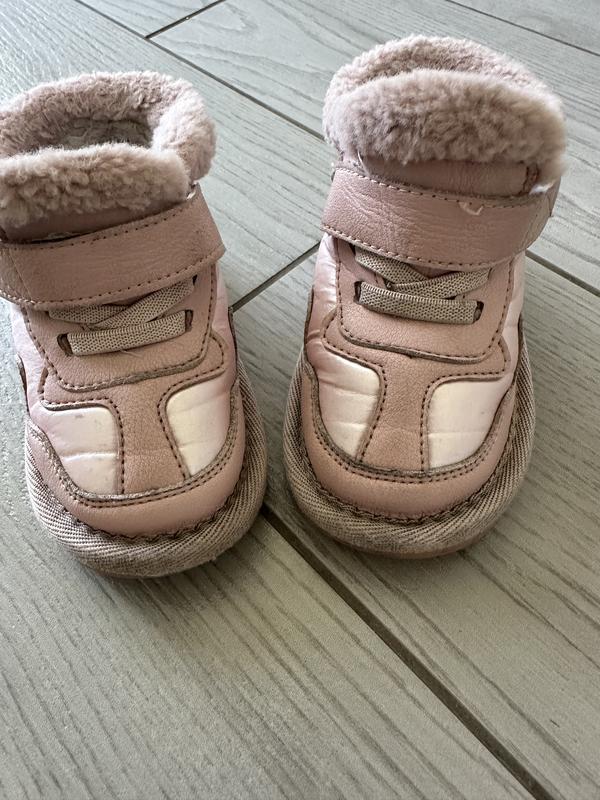 Теплі зимові черевички. Дуже гарні. Написано, що устілка 14 см. В ідеалі, враховуючи теплий носок, на ніжку до 12,5 -13 см. Є один дефект- липучки відірвалися, я їх просто пришила, бо вже зима закінчувалася. Можна в ательє замінити липучки. Враховано в ціні. Дитина ходила мало, бо тільки починала. Більше в колясці їздила