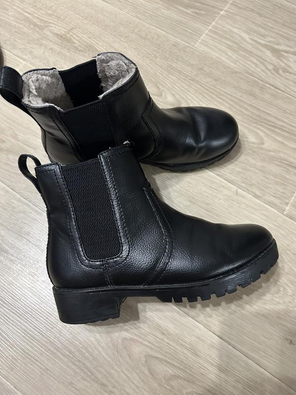 Стан гарний Всередині утеплені По бокам мають резинки, зручно взуватися Підошва резинова, не слизька Матеріал верх - штучна екошкіра Розмір 35, устілка 22 см