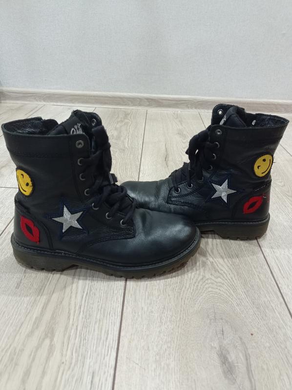 Стильні чорні шкіряні черевики "V Mitch" прикрашені смайликом, зіркою та принтом губ. Черевики натуральна шкіра, мають легке утеплення. Стан дуже гарний, без подряпин. Довжина устілки повна 24 см