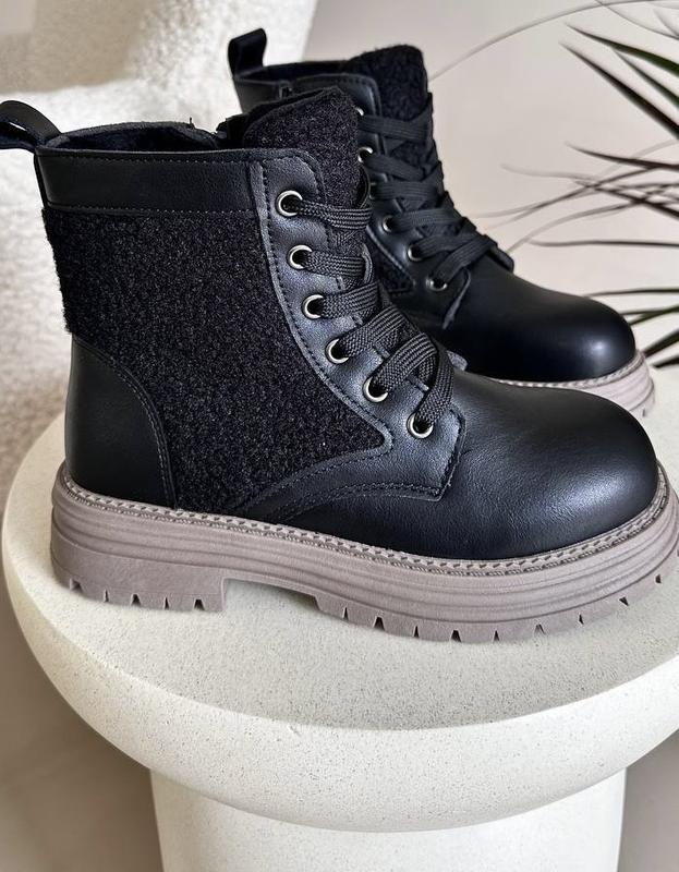 Верх якісна еко-шкіра та комбінація хутра тедді Фіксація шнурівкою та боковий замочок Всередині темне хутро (60%овчина) Устілка також утеплена +супінатор Стильні та зручні! 32р - 19.8 см 34р - 21.2 см 35р - 21.8 см 36р - 22.6 см