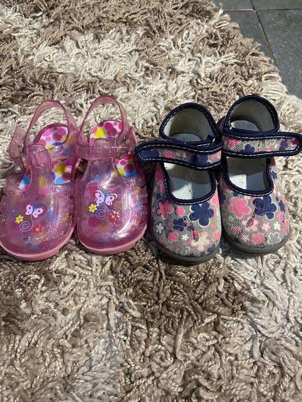 Текстильні, легкі та зручні • Колір: сірий із яскравим квітковим принтом (рожеві та сині квіти) • Застібка на липучці для зручності • Гнучка підошва, підходять для прогулянок і дитсадка • Є сліди носіння, але ще у доброму стані *Ціна- 70грн Сандалі прозорі, рожевого кольору, з блискучим напиленням по всій поверхні. Взуття має закритий носок і, а також ремінець для фіксації на нозі. *Ціна-70грн За все разом 110грн
