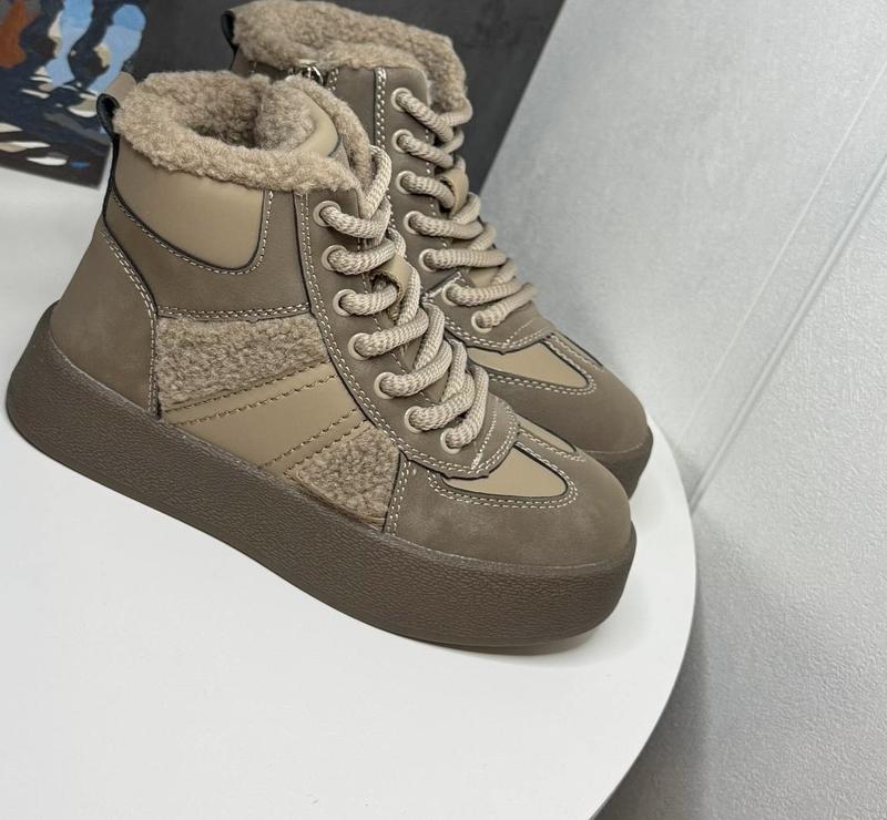 Якісна еко шкіра з комбінацією барашка Всередині тепле хутро ( натуральна овчина 60 %) Устілка також утеплена Фіксація шнурівкою.,бокова застібка 33-21,3 см 34-22 см 35-22,5 см