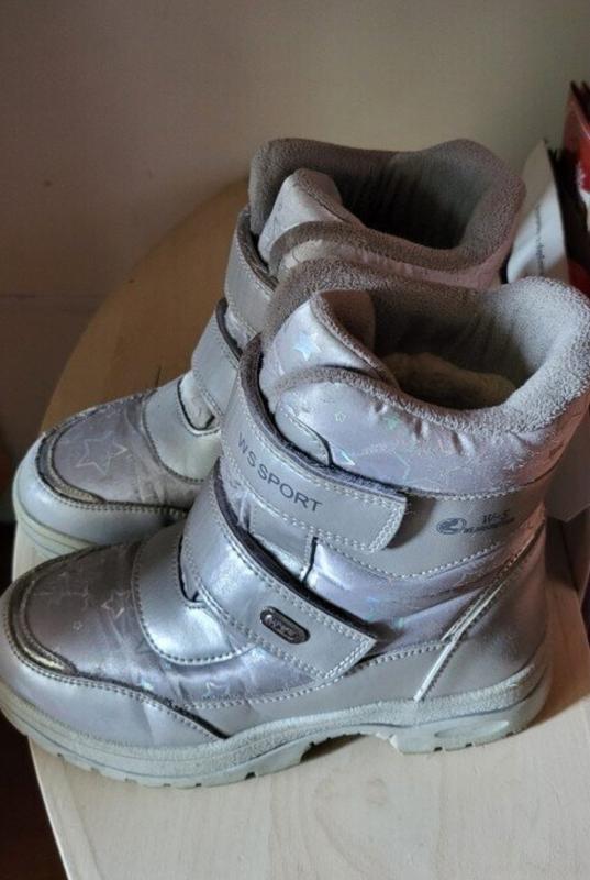 Мають зручну застібку на липучках (два ремінці), підошву з протектором і легкий спортивний дизайн. На боковій частині напис “WS SPORT”. Матеріал зовні — водовідштовхувальний, з блиском і візерунком зірочок, утеплені всередині м’яким штучним хутром. Після однієї дитини.