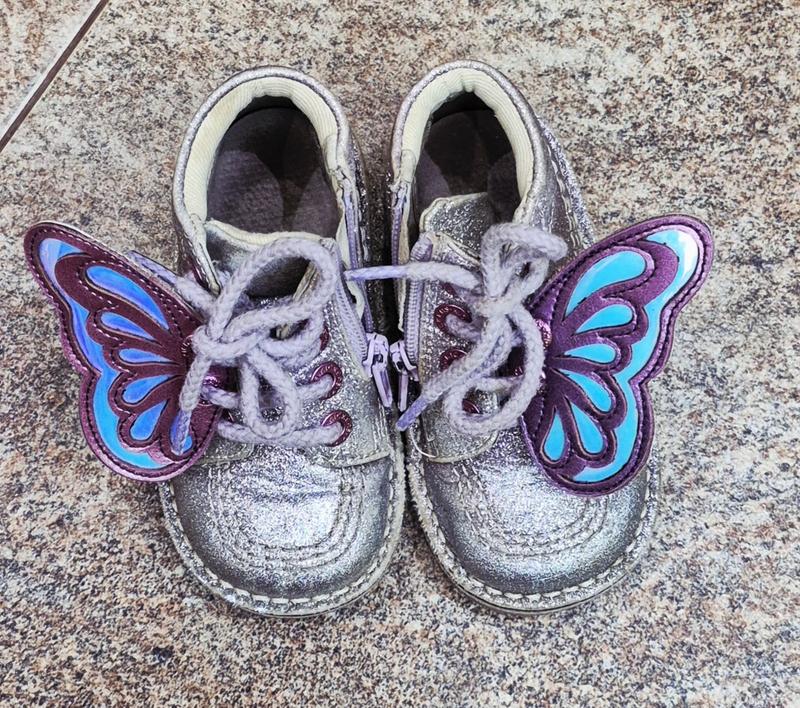 кожаные ботиночки на молнии розово-серебристые в идеальном состоянии в которых малыши могут стильно выйти на улицу, надев эти очаровательные сапоги Kickers стелька 15см Эти яркие нижние ботиночки с блестящей отделкой имеют шнуровку, молнию и объемное крыло феи с каждой стороны. благодаря молнии легко и быстро надевать