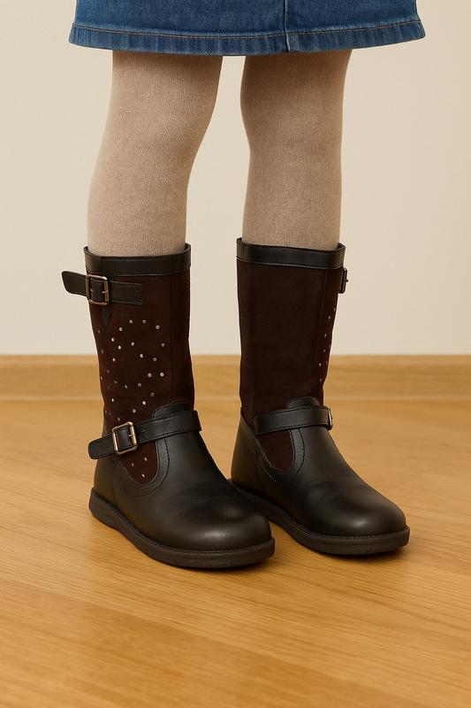 Комбінація гладкої екошкіри та замші з дрібними блискітками й ремінцями — виглядають дуже гарно на ніжці 💕 Усередині теплі, застібка-блискавка збоку, зручна підошва, гарно тримають форму. Є невеликі потертості спереду та по верху, незначні складки від носіння — загалом стан гарний, вигляд стильний і охайний 🌸
