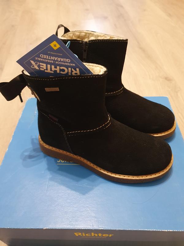 Нові черевики для маленької принцеси. Верх якісна замша з технологією Waterproof. Утеплювач штучна овчина. Висота 12/14. Ззаді невеликий бантик (знімається). Довжина устілки 19.5. Насичений чорний колір. Каучукова підошва. Німецька якість .
