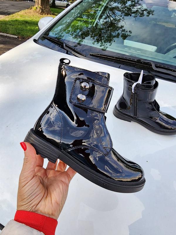 Нові лакові демісезонні черевики Geox Eclair Оригінал. Привезені з Англії розм.32. повна довжина устілки 20.8см, ширина 7си, висота 15.5см Сезонність: демісезон - Колір: чорний - Верх – штучний лак - Підкладка: текстиль - Утеплювач: ні - Застібка: внутрішня змійка - Знімна, утеплена коротким штучним хутром, устілка - Красиві широкі велюрові шнурки однозначно прикрашають цю пару - Наявність стабілізатора п'яти, який щільно утримає п'яточку на місці - Колодка відповідає всім вимогам ортопедів та повторює повністю правильний вигин стопи!