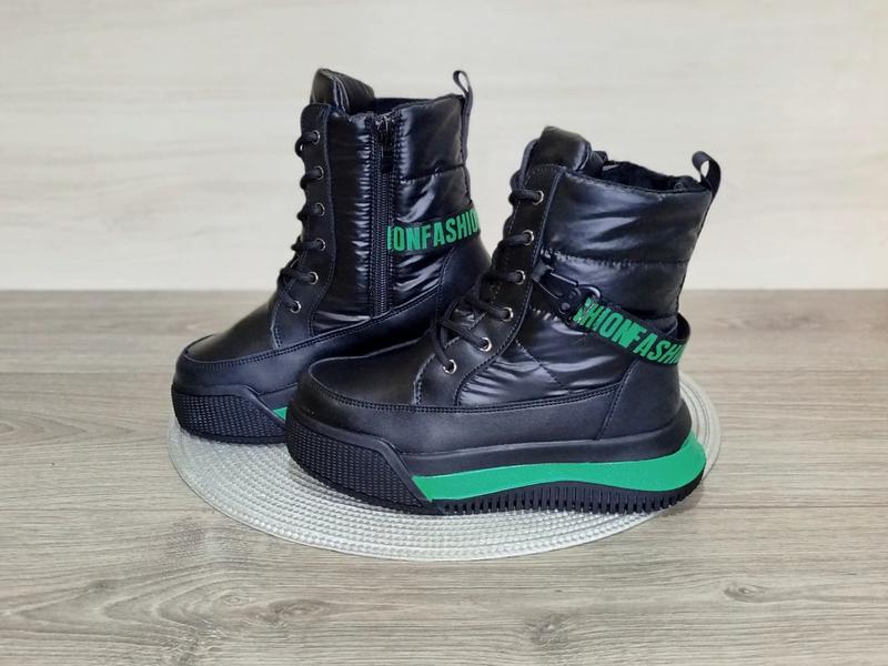 ТМ: Kimbo-o. Цвет [арт.]: black & green. Код: F123. Материал внешний [верхний]: плащевка, искусственная кожа. Материал внутренний [подкладка]: искусственный мех, флис. Стелька: съемная, двухслойная, искусственный мех. Фиксация стопы: замок-молния, шнуровка. Платформа: высота в пятке ≈3.3 см, материал PVC. Вес полу-пары в размерном ряду: 415~505 г. Размерный ряд: 33-38 [21.4~24.7 см]. Замеры стельки: р.33 — 21.4 см р.34 — 22.0 см р.35 - 22.7 см р.36 — 23.4 см р.37 — 24.1 см р.38 — 24.7 см
