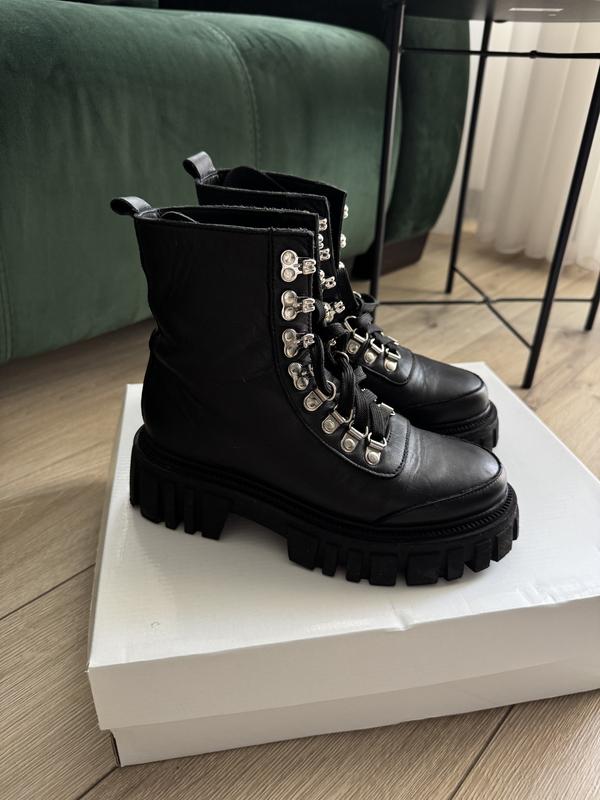 Стильні чоботи українського бренду😍 натуральна шкіра, всередині на байці. Стан супер. Тільки помʼята шкіра .