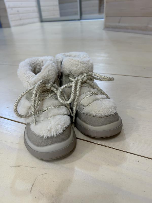 Чудові зимові черевики бежевого кольору для дівчинки від бренду Zara. Були у використанні один сезон, тому в чудовому стані. Розмір 26 ( устілка 16 см). Легкі, зручні та дуже теплі. Сліди носіння не замітні (трішки стерлась фарба на бігункові та резина на підошві - є на фото).