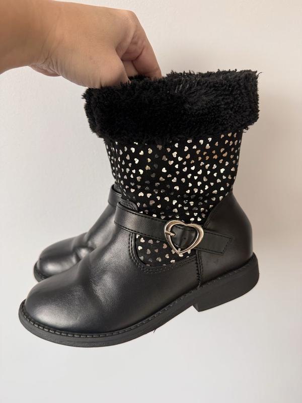 Красиві черевики/ботильйони для дівчинки. Оздоблені сріблястими сердечками та пряжкою і формі серця. Защібаються на змійку. Підходять для єврозими. Стильні та практичні. Довжина підошви 23 см. Недолік незначний, на останньому фото, в ціну враховано.