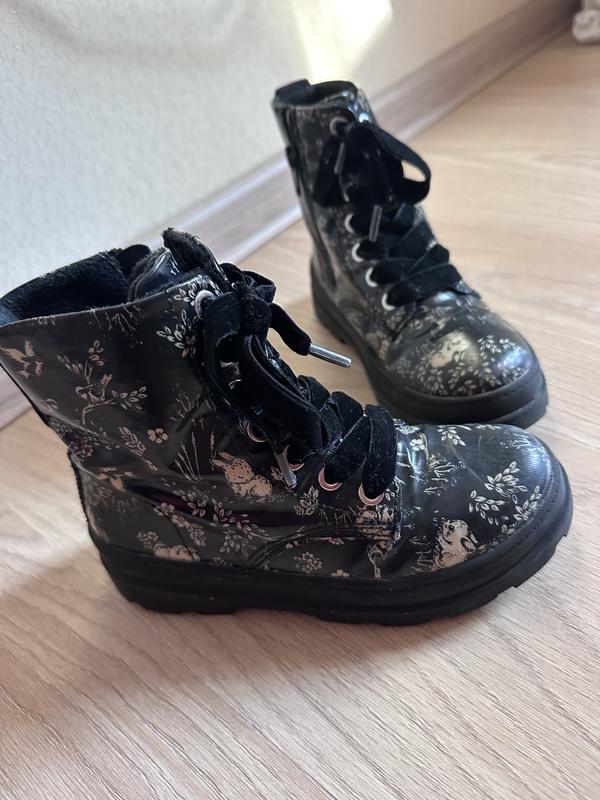Чорні ботинки з декором зайчики, на бархатних чорних шнурках. Трішки лаковані, в дощ ноги були сухі. Утеплені байкою.