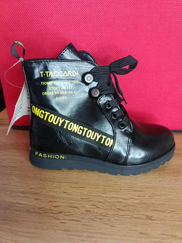 Стильні демісезонні черевики для дівчинки у чорному кольорі. Модель виконана з глянцевого матеріалу, має зручну шнурівку та декоративну стрічку з написом. Легка підошва забезпечує комфорт при щоденній ходьбі. Гарно поєднуються з джинсами, легінсами та сукнями. 🔹 Колір: чорний 🔹 Сезон: весна/осінь 🔹 Матеріал верху: еко-шкіра 🔹 Застібка: шнурівка + блискавка 🔹 Підошва: легка, гнучка 📏 Розміри в наявності: 28 — устілка 19 см 29 — устілка 19,5 см