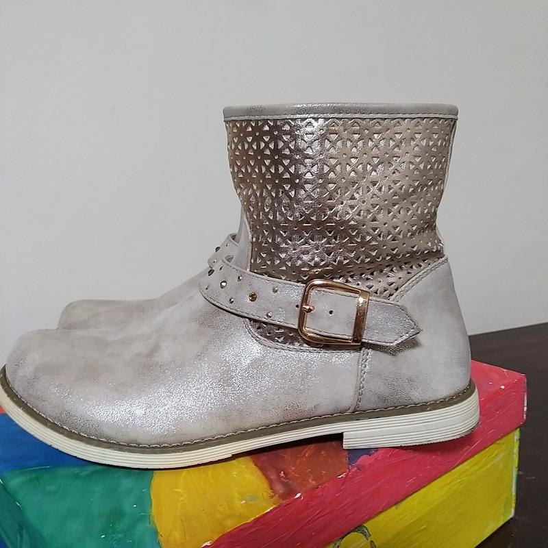 ботинки демисезонные , кожзам, серебристые, очень красивые, ношены пару раз, переросли. размер 35 по стельке 22 см. внутри одного ботинка брак. На фото показала. Такими и куплены по уценке в магазине " Антошка".