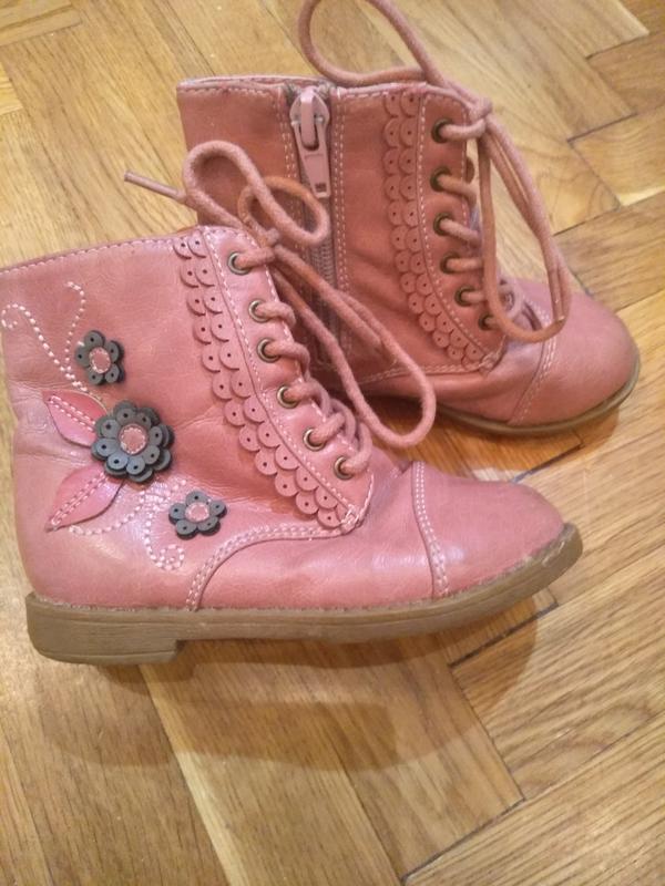 Дитячі демісезонні шкіряні черевики Mothercare на баєчці. Колір рожевий. Збоку застібка блискавка, попереду шнурівка. Підошва поліуретан. Прошиті, красиво декоровані. На одному каблуку ззаду є дефект - стертий шматочок підошви, на ходьбу не впливає. Розмір 24, устілка 16-16,5 див. Оплата і пересилання за домовленістю. У Києві можлива зустріч.