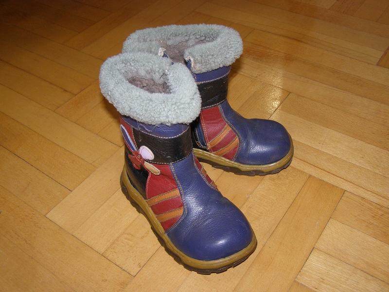 Детские зимние ботинки на натуральной овчине. Для девочки ( расцветка универсальная, но сбоку есть что-то на подобии цветка). Подошва полиуретан. Из недостатков: нерабочая молния на одному из ботинков; на внутренней стороне ботинков есть на коже потертости ( см. фото). стелька вытерта в районе пятки ( см. фото). Размер 31, стелька 18,5 см.