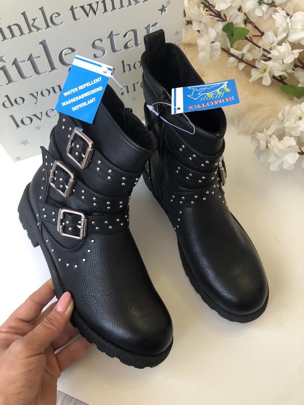 614. Очень классные демисезонные ботинки с заклепками и ремешками. Размер 34. Материал эко кожа - очень хорошего качества! Ботинки выглядят очень стильно и в тоже время очень "добротно". 1) Технология WATER REPELLENT. Кожа обработана веществами, предназначенными для защиты материалов от воздействия влаги. 2) Мембрана SUMO-TEX имеет конкретные преимущества в плане водонепроницаемости и комфорта. Внутри поддерживается оптимальный микроклимат, так как мембрана не пропускает воду и холодный воздух, но позволяет ноге «дышать».