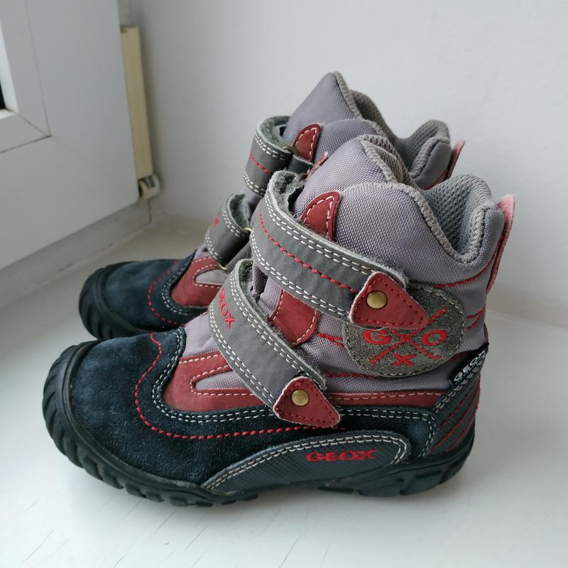 Фірмові демісезонні черевики Geox 25 розміру, дихаюча устілка, 16 см до загину, 16,8 см з загином. Дивіться замір устілки на фото. Матеріал верху натуральна шкіра, натуральна замша. Водонепроникні. Липучки липнуть відмінно. Носилися дуже мало, стан відмінний. Виробник Італія.