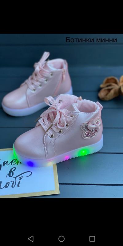 ✔ Нежные деми ботиночки со светящейся подошвой! Отличное качество! Осенние- утепленные! Стелька кожа, супинатор Застежка- сбоку змейка, спереди - шнуровка. Минни- камушки и бантик ✔ Размеры: 26-15,5 27-16,2 28-17,0 29-17,5 30-18,2 ✔ Цена: 230 грн допустимая погрешность +- 2 мм