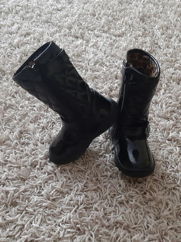 Стильні лаковані чобітки F&F. Розмір вказано 6/23, довжина устілки приблизно - 13,5 див., оскільки устілка не витягується. Всередині утеплені флісом. Висота чобітка з підошвою - 16см. В дуже хорошому стані, з дефектів незначні царапини на лівому чобітку, на останньому фото вказано, при ходінні незамітно. Не на широку ногу і не на високий підйом.