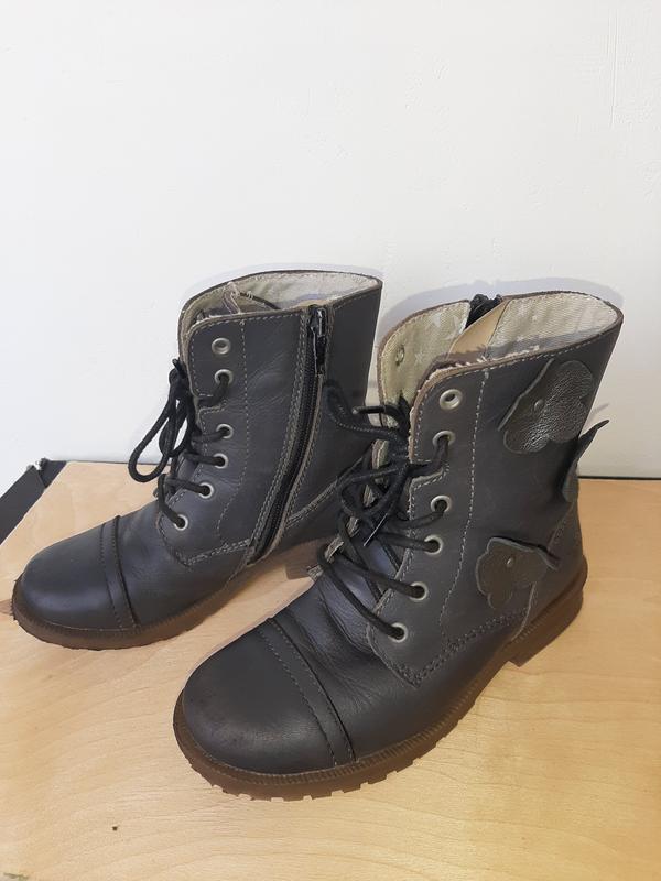 Черевики шкіряні, всередині тканинна підкладка, на шнурівках+ замок з середини. Є дефект потерті спереді носочки.