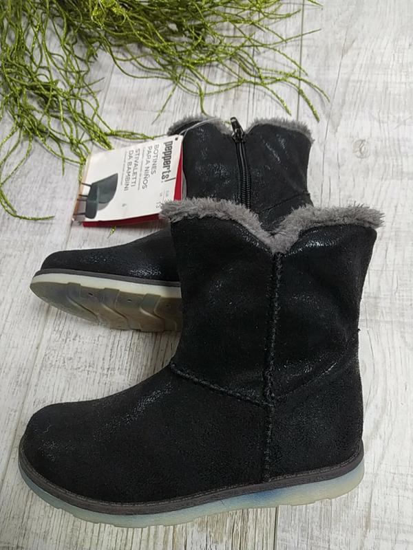 Чоботи оригінал. Верх екошкіра, підкладка штучний хутро, підошва поліуретан. Розміри: 32 устілка 20,5 см. Є косметичний дефект на підошві видно на фото.