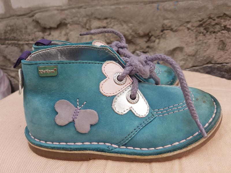 Шкіряні черевички Kickers. Гарні якісні черевики. На підошві кольорові кружечки, завдяки яким дитина може визначити де лівиц, а де правий черевик. Стан гарний, але потрібна чистка зовнішньої поверхні.