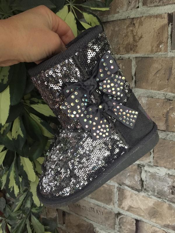 Дуже грайливі, легенькі, тепленькі,вишиті паєтками угі з бантом , порадують будь-яку дівчинку принцесу. Угі виконані з еко-замша, штучний хутро, але натомість тепленткі та практичні. Взуття в ідеальному стані, не вихожене,без нюансів, мало було в носкі, завжди на машині практично. На бантіку немає пару камінчиків на фото показала. Устілка -17 см , вказано розмір 28 альо маломірять трішки.
