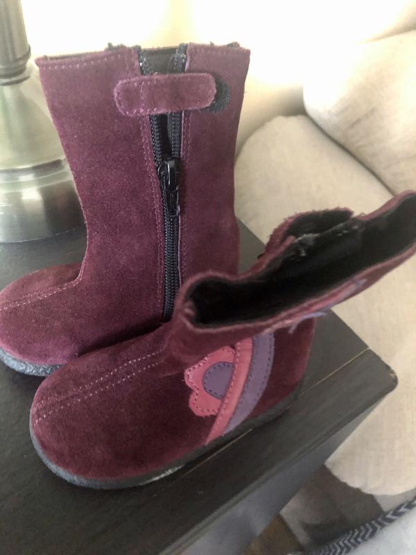 Замшеві чобітки, гарний бордовий колір, нові, виробник Іспанія. 19 розмір. Можна ще більше фото.