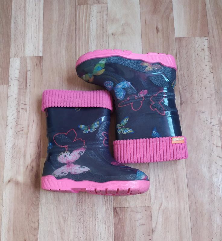 Резиновые сапоги для девочки. Материал верха - поливинилхлорид. Материал подкладки - махра. Отличные сапожки, не промокают, чехол легко вставляется. Состояние очень хорошее. Размер 27. Длина стельки 17 см.