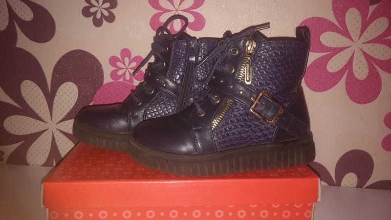 Стильний осінні черевики на дівчинку темно-синього кольору, на невеликій платформі. Розмір 29, по устілці 18 смсама підошва з довжиною 20 см, висота платформи спереду на 2 см, ззаду 2,5 див. Застегиваюися на бокувую блискавку + спереду на шнурках з декоративним ремінцем. Дуже зручні, підійдуть на будь-яку форму ніжки. Зручно регулювати за повноту ніжки. Міцні і практичні, відмінні варіант на осінню погоду. Навіть в дощ в них зручно і не промакают. За рахунок платформи дуже практичні. Стан дуже хороший. Єдине спереду трохи збиті, але зовсім трохи. При носінні і на такому кольорі не помітно. А так повністю цілі, немає ні дірок, ні інших яких-то подряпин і ніде не отклеены, п'ятка не затоптана. Все на місці і ціле. На фото усе видно. Якщо є запитання пишіть або телефонуйте.