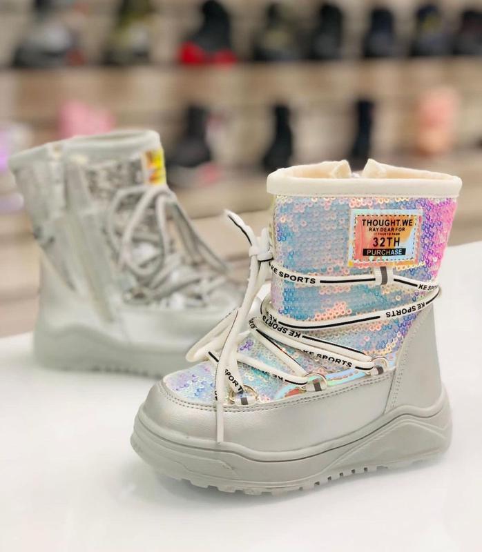 Шикарні луноходики в паетках❄❄ На ніжці супер👍👍 Легкі і зручні Підходять на будь-який підйом ◼пудра ◼срібло з білим ✔всередині густе хутро 60/40 натуральний, температурний режим до -30 ° ✔збоку блискавка ✔не промокають 24-15, 5 см 25-16, 2 см 29-18, 8 см 30-19, 5 см