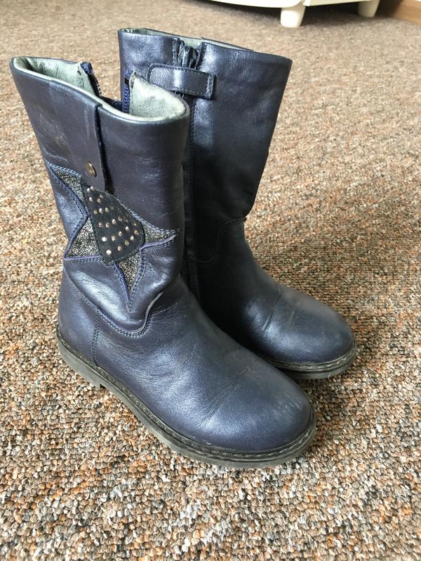 Повністю кожані сапожечки на дівчинку, м'яка шкіра, на вузеньку ніжку. Дуже гарно виглядають, на шкода нам були вузькуваті того одягнули декілька разів. Трішички спереду стерті, майже не замітно на фото видно довжина устілки 16см
