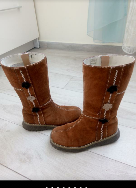 Коричневого кольору з декором.Натуральна замша,в гарному стані,можна носити при -1градусі.Прорезинова підошва.
