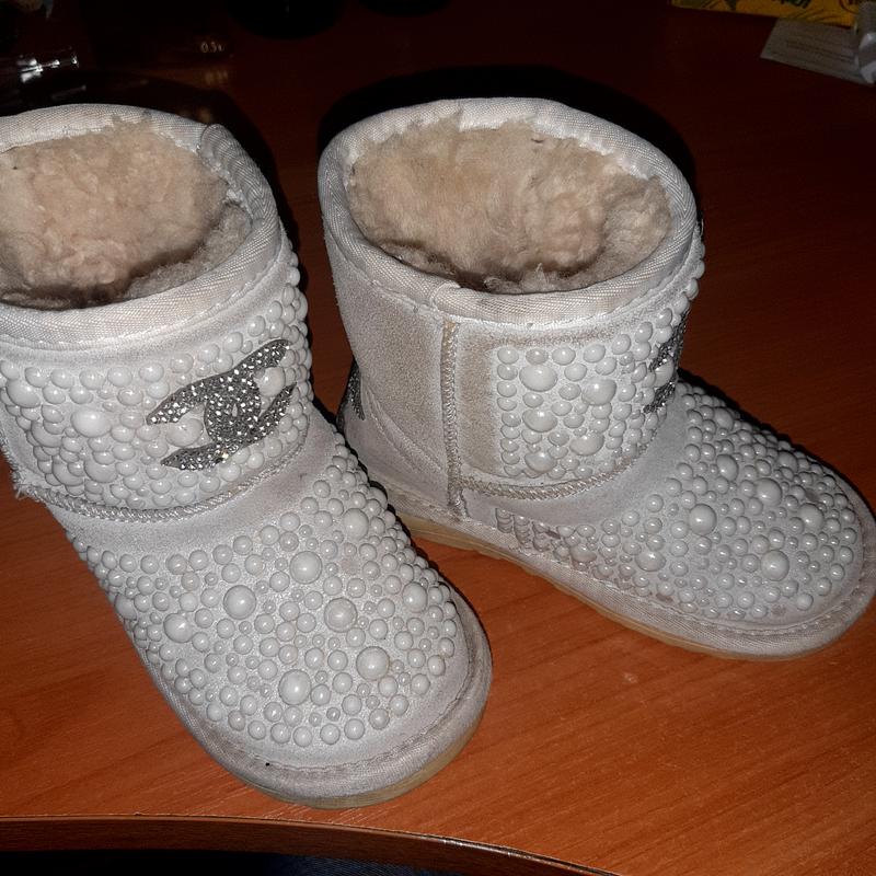 Стан відмінний натуральний замш , всередині овчина, дуже теплі й гарні. підошва 20, устілка 17 фабричний Китай, купувала дуже дорого. з нюансів частково виспалися камінці і немає штук 10 намистин, в повсякденному носінні это6о не видно. колір перлинні.