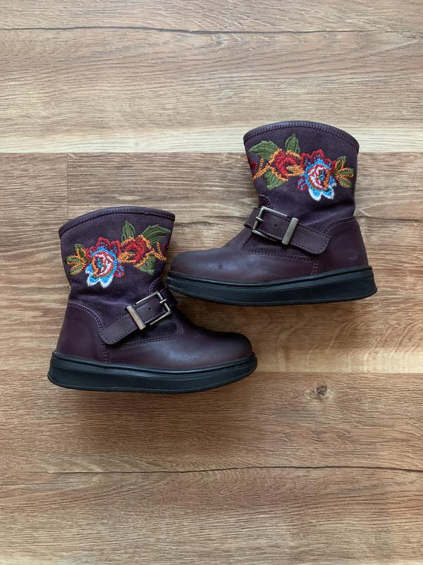 Дуже красиві ортопедичні чобітки, прикрашені вишивкою. Усередині дуже теплі, на цигейке. Колір темно фіолетовий. Стан відмінний. Розмір 23 - 14,3 см