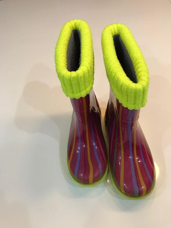 Страна производитель: Польша Верх обуви: литая оболочка из ПВХ, имеющая высокие износостойкие и водоотталкивающие свойства. Внутренняя часть: съёмный утеплённый чулок из полиэстера, для утепления ноги. Можно вынуть чулок из сапога и использовать обычный шерстяной носок. Подошва: имеет отличный протектор. Цвет: розовые полоски. Выступающие края подошвы, а также кант утепляющего чулка, выполненные в контрастном цвете, придают модели радостный и яркий вид. Подъем: высокий. Длина по стельке 16 см.