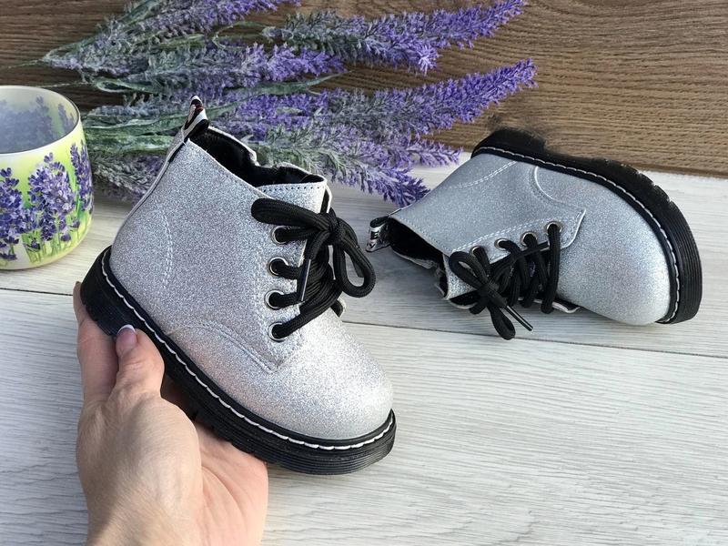 Без кнопки замовити Стильні демі черевички. Верх екокожа з напиленням перламутру, виблискують. Всередині утеплені м'яким плюшем шкіряна Устілка з супінатором .Жорсткий задник - хороша фіксація ніжки Фіксація шнурівка + збоку блискавка. колір срібло 23 розмір 14 см (2 шт
