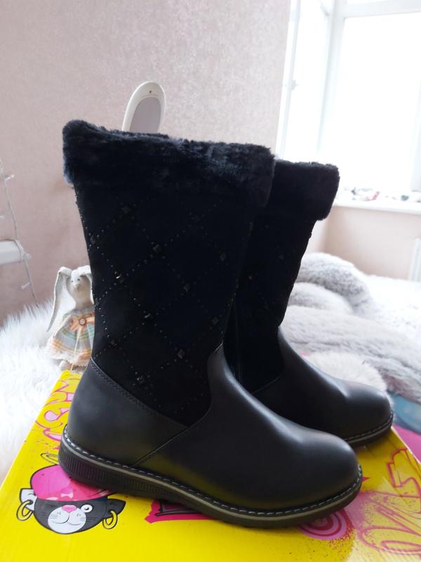 Сапоги зимние для девочки, черные, новые р. 36 Размер - 36, длина стельки 23,3 см Сапожки прошиты по всей окружности стопы. С внутренней стороны застегиваются на молнию Верх - искусственная кожа+ искусственная замша, внутри - теплёнький, мягкий, уютный искусственный мех. Плотный задник. Для гигиены стопы стелечка вынимается. Подошва из износоустойчивой термопластичной резины, не требующей набоек Ребристая подошва против скольжения сапожек. Оплата 100% на карточку или наложенным платежом.