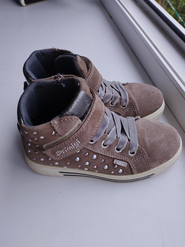 Чудові демісезонні чобітки. Якісні- мембрана Gore-tex, зручні- гнучка підошва. Липучка тримає міцно, довжина устілки 18 см. Зафіксовані резинкою яка тягнеться. Шкіряні, стан ідеальний.