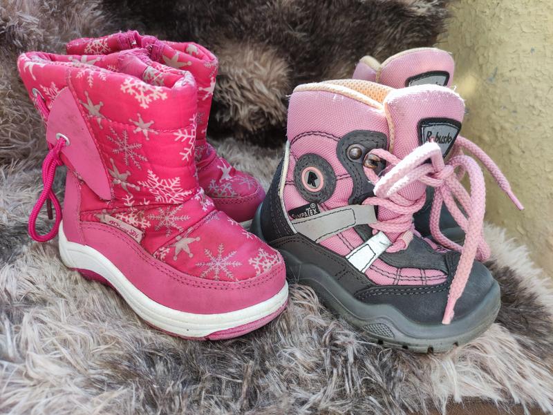 Сапоги зимові на дівчинку, обидві пари 22 розміру, довжина устілок також однакова. Стан гарний, носки не збиті.