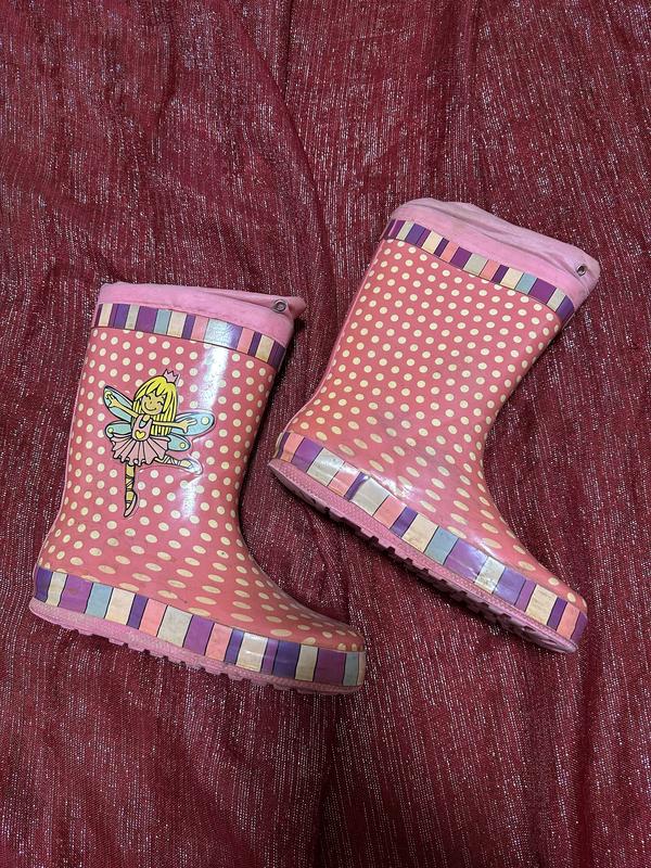 Гарні гумові дитячі чоботи для дівчинки/ Підійде на 31-32 розмір/ Висота 22-24 см/ Ширина підошви 8,5 см/ Устілька 21-21,5 см/ Місцями незначні плями на фото видно,у ціні враховано,продається як є без повернення/