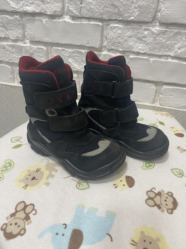 Чобітки зимові Ecco, можуть бути як дівчинці, так і для хлопчика. Водонепроникні та тепленькі. Устілка не виймається. Орієнтовно 17 см устілка, зовнішня сторона підошви на фото-20 см. Стан хороший.