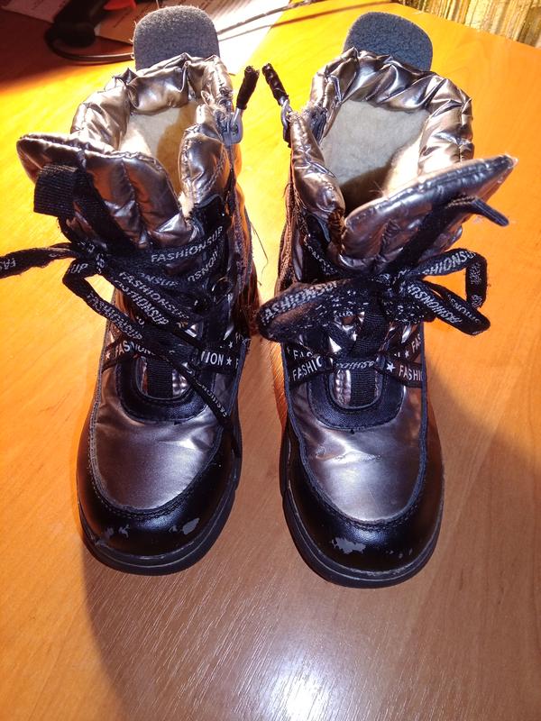 Чобітки зимові для дівчинки, дуже теплі. В цілому стан добрий але іноді заїдає блискавка і трохи збиті спереду (останнє фото). Розмір 29, устілка 19 см.