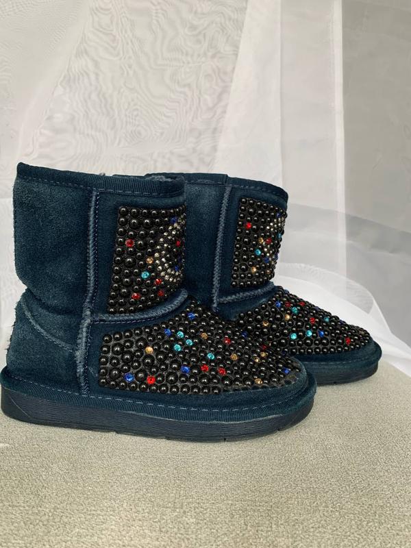 Якісні та привабливі зимові уги зі стразами з візерунком 32 розміру (устілка - 20см). Дуже теплі та зручні, підійдуть і для вузької і для ширшої ніжки. Блискітки щільно посаджені на клей, а отже, не пропускатимуть вологу порівняно з іншим взуттям.